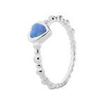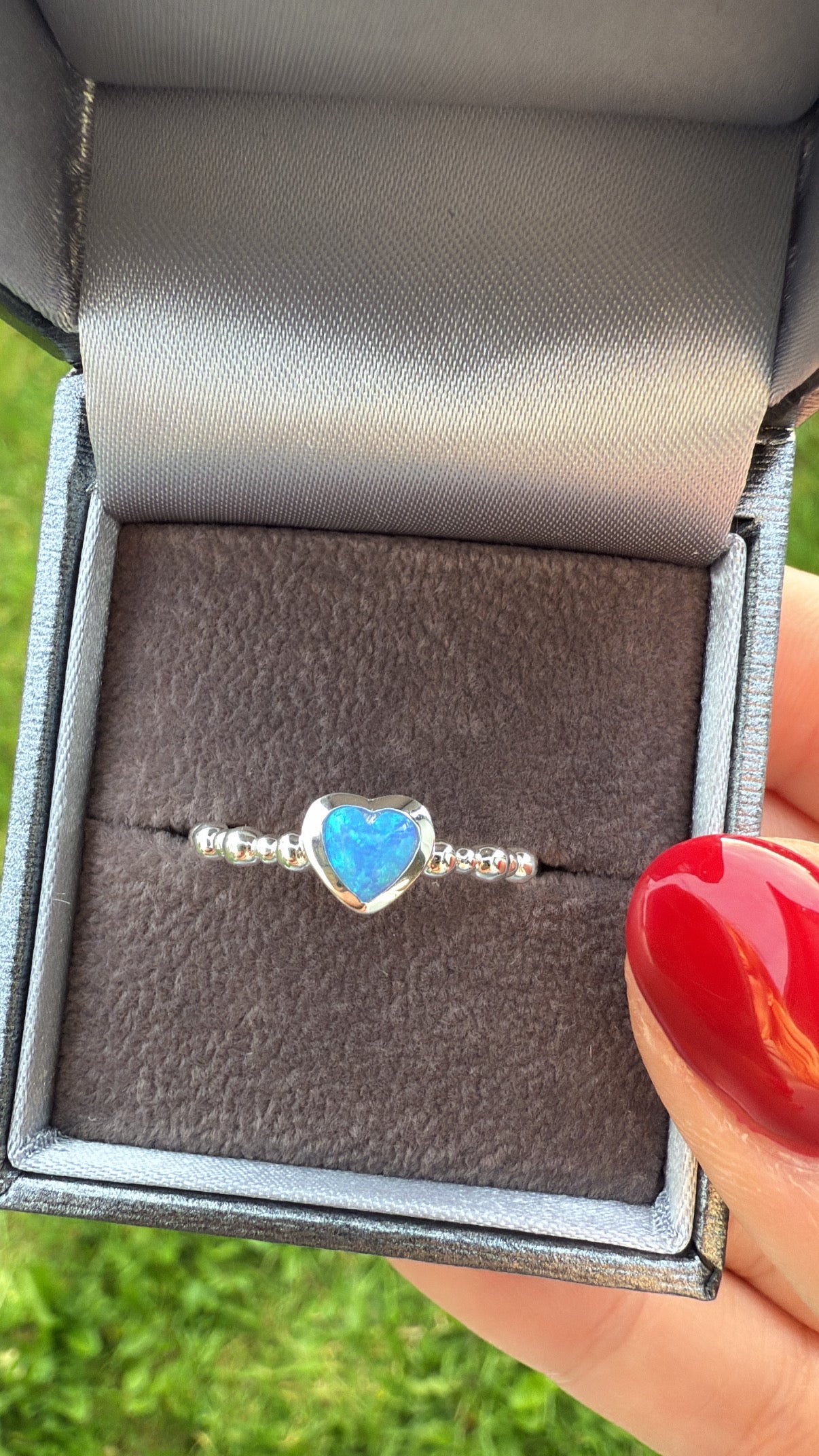 Romantic and vibrant, this ring is crafted from 925 sterling silver and features a striking blue opal heart that shimmers with flashes of ocean-inspired colour. The beaded silver band adds a playful touch of texture, making this piece both unique and effortlessly wearable.
