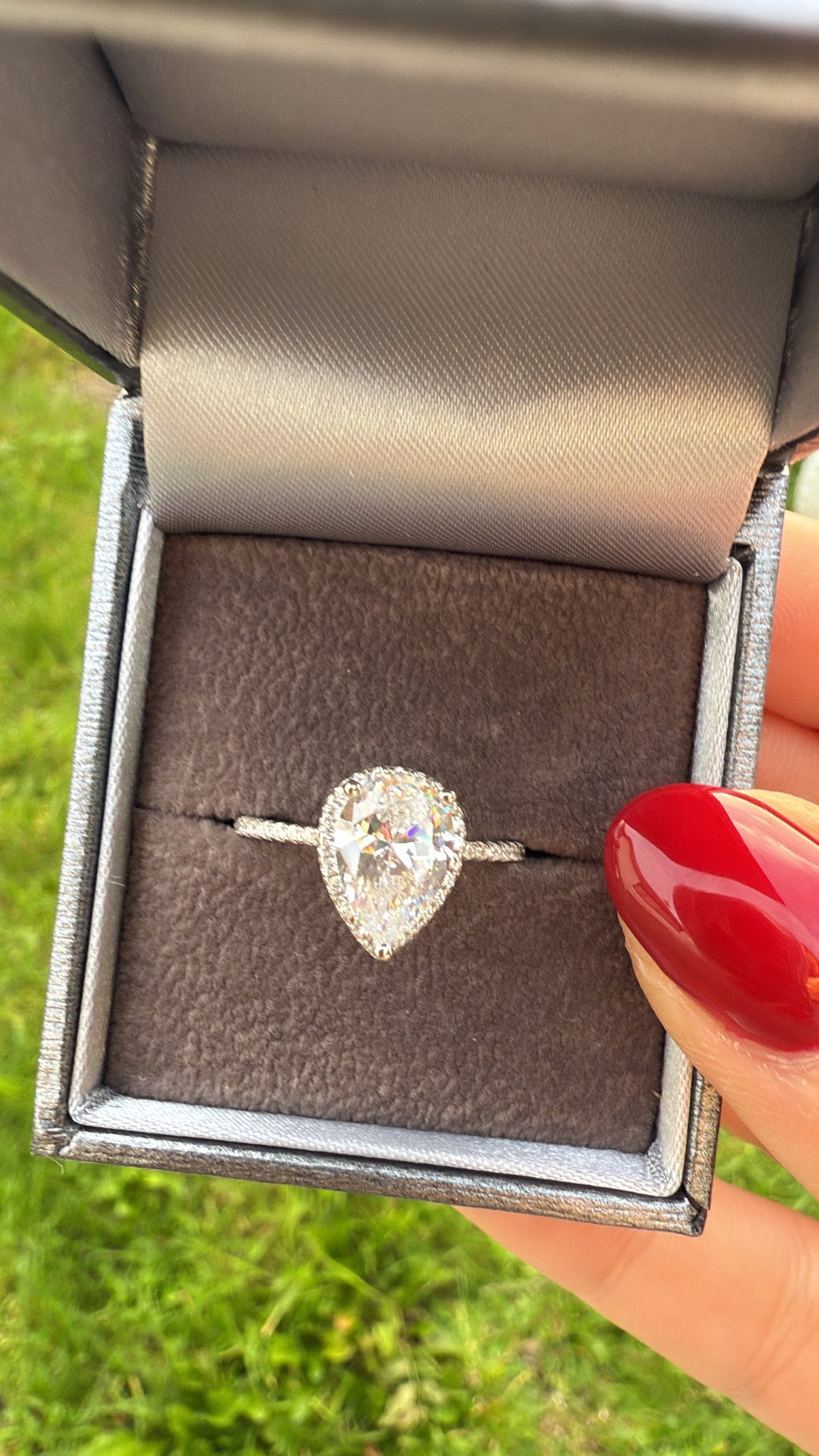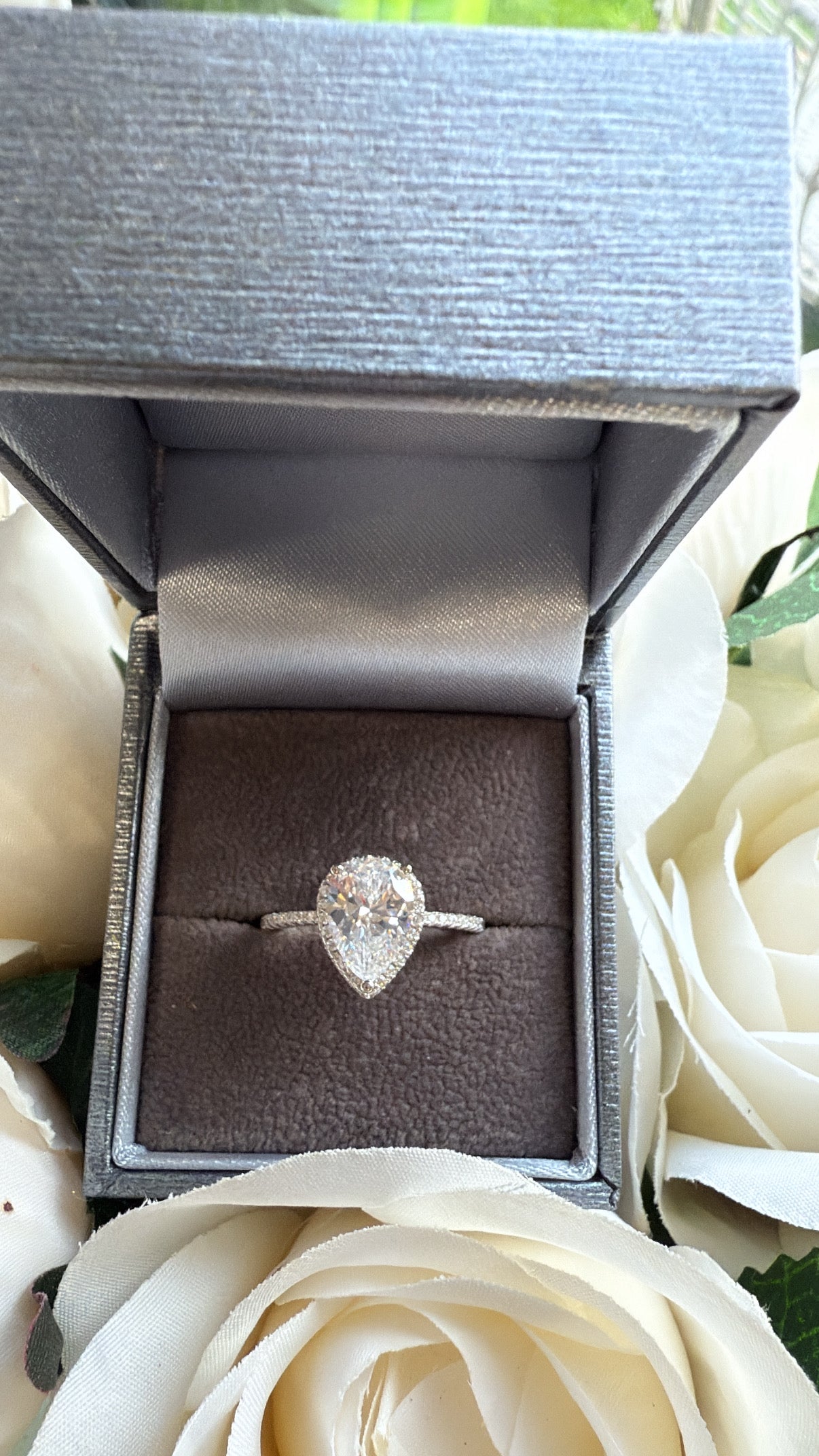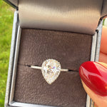 • Stones: Pear-Cut Cubic Zirconia with Halo & Pavé Band
