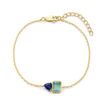 A royal blue trillion-cut stone and a cool mint green emerald-cut stone sit side by side in a paired cluster centrepiece, set in gleaming gold-plated prong and bezel settings. The duo strikes a perfect balance — bold in colour yet refined in scale — making this bracelet as wearable every day as it is for special occasions.
