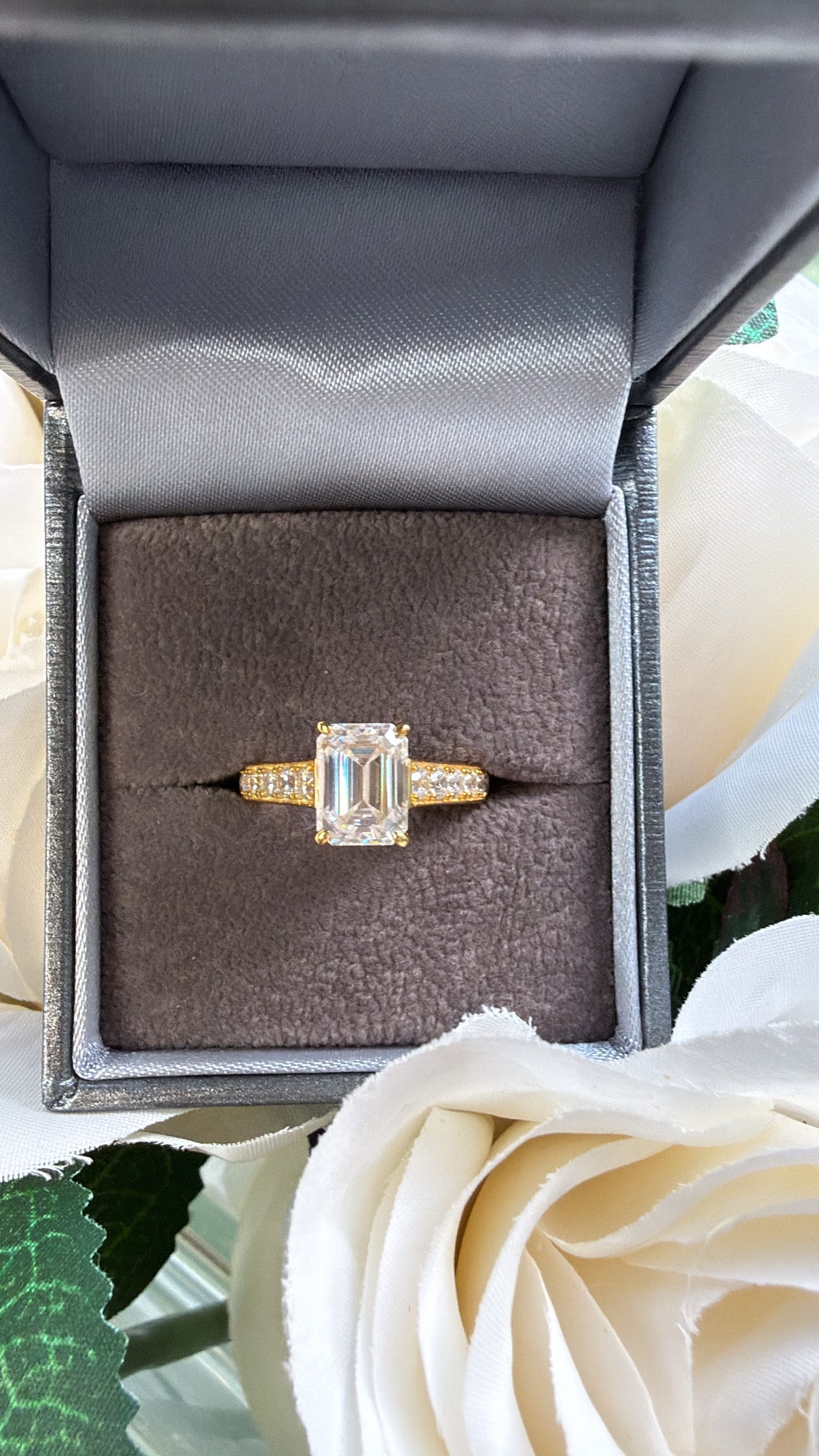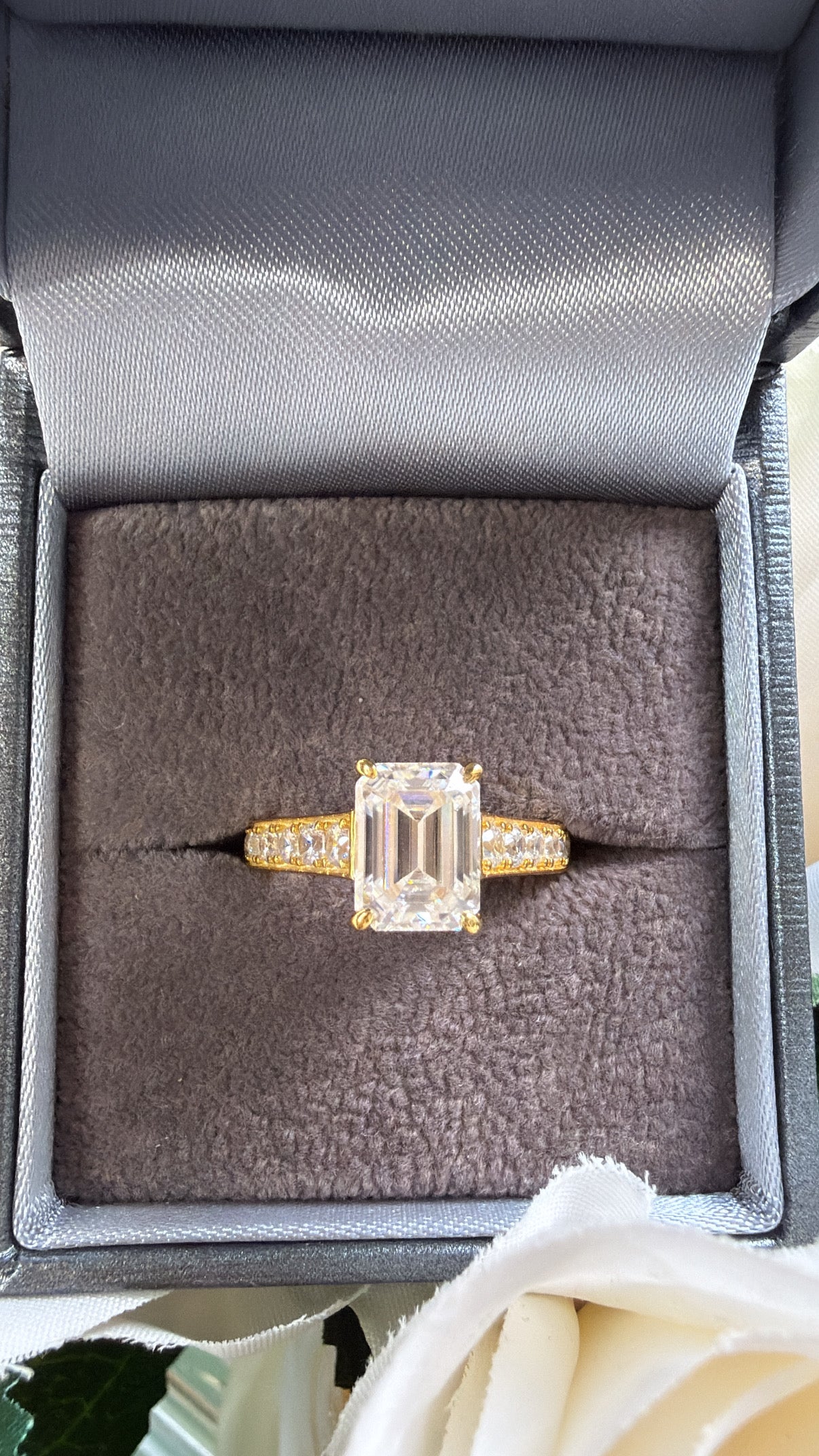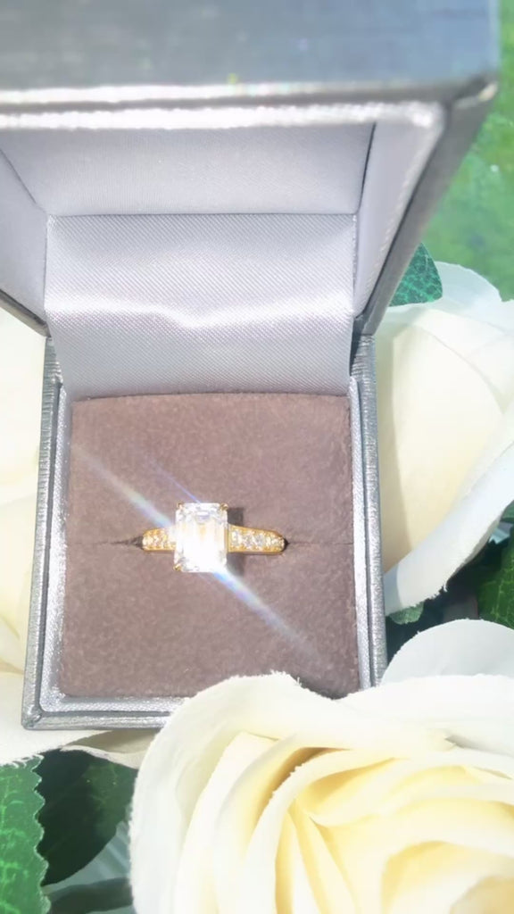 • Centre Stone: Emerald-Cut Moissanite