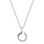 Complete your look with this beautifully crafted sterling silver multigem necklace — the perfect partner to our matching stud earrings. The pendant features a modern open-circle design, accented with a trio of vibrant bezel-set stones: a rich sapphire blue, a warm amber square, and a striking marquise-cut green. The lower arc of the circle is lined with sparkling cubic zirconia, adding a touch of radiance that catches the light with every movement.