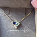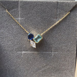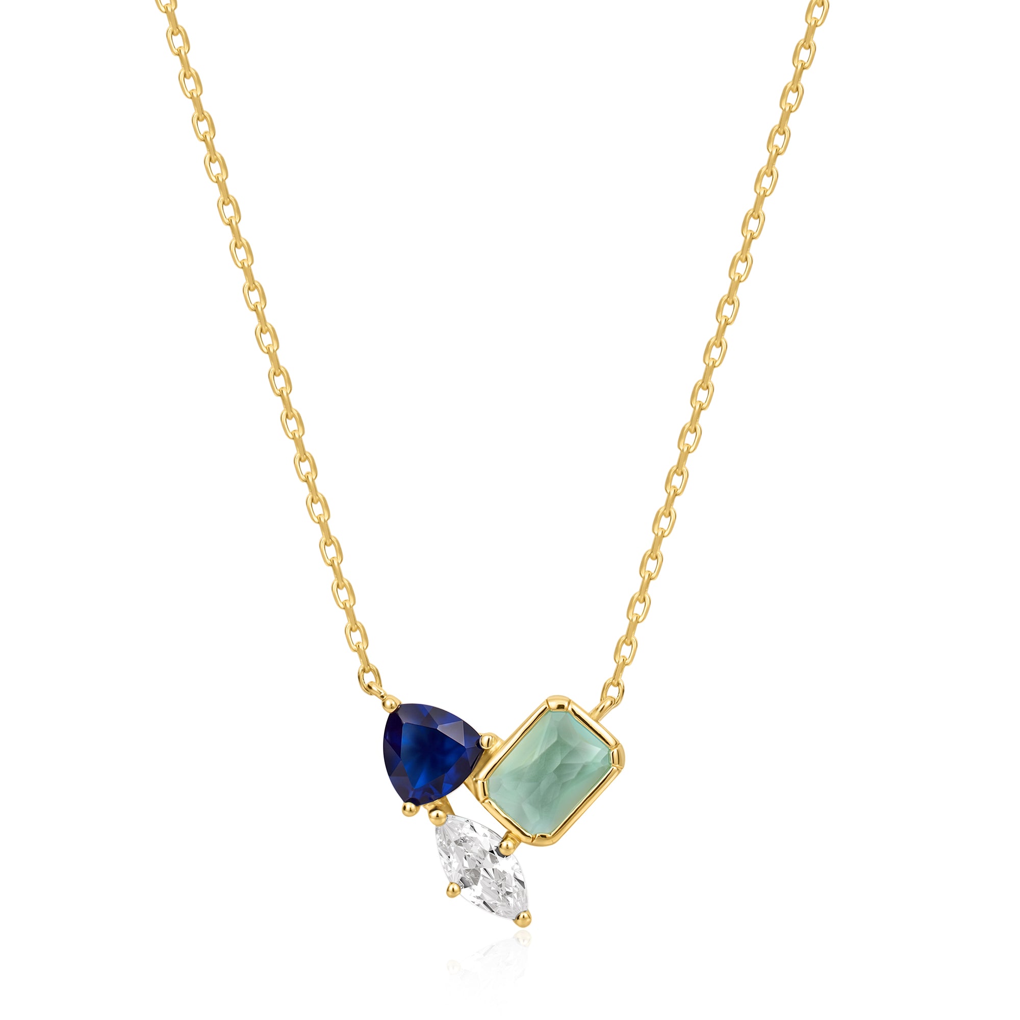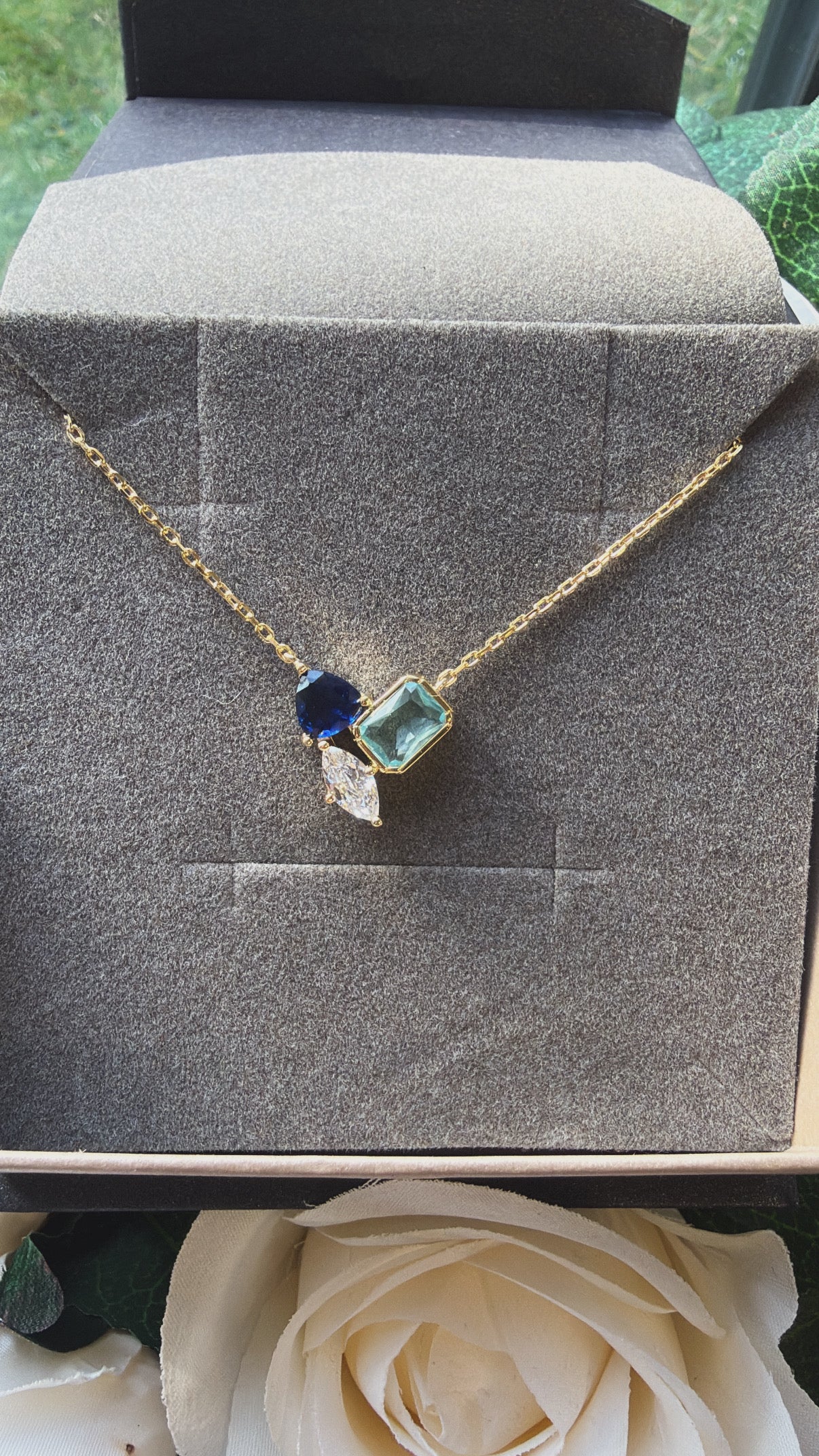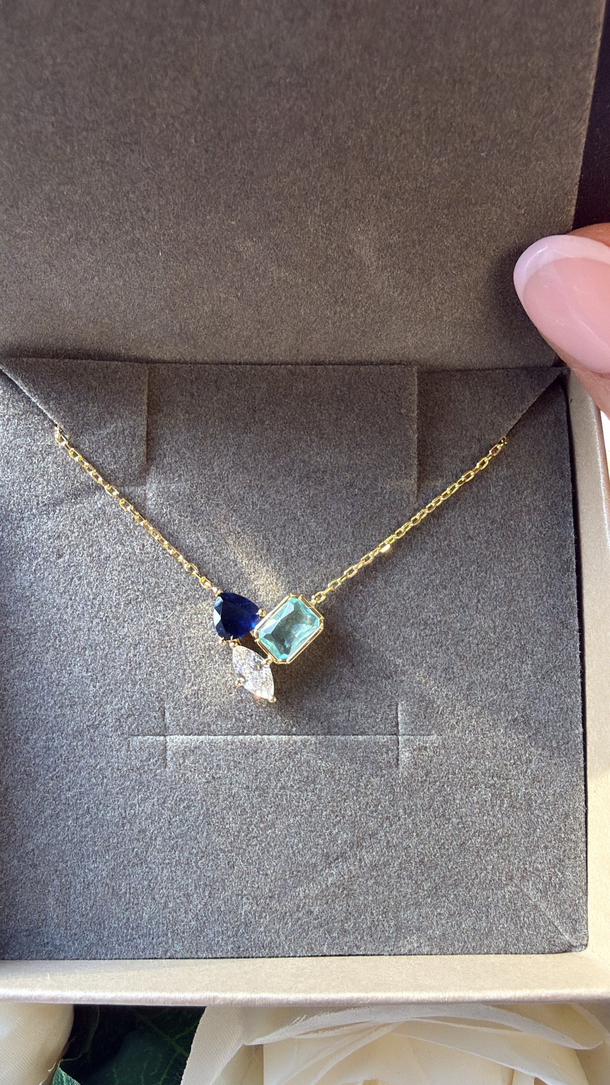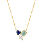 Three beautifully cut stones nestle together in an asymmetric cluster — a cool mint green emerald-cut stone, a rich royal blue trillion-cut stone, and a sparkling clear marquise-cut crystal — all set in gleaming gold-plated prong settings. The result is a pendant that feels collected and intentional, with just the right amount of colour and sparkle.